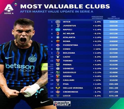 德转更新后意甲俱乐部球员总身价排名: