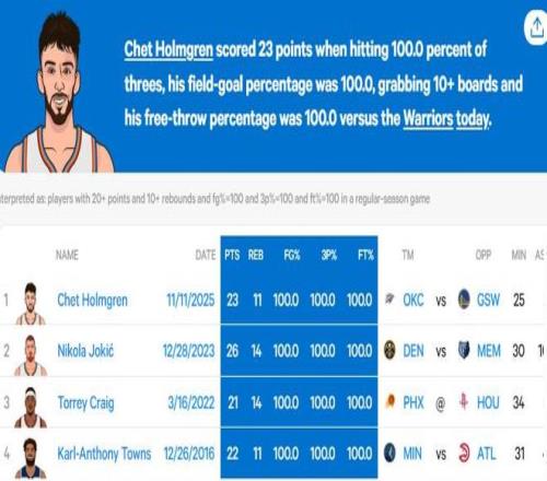 本场比赛,雷霆队内线切特-霍姆格伦出战24分39秒,9投全中砍下了23分11板2助攻1盖帽,三分2中2,罚球3中3,所有投篮命中率均为100%。