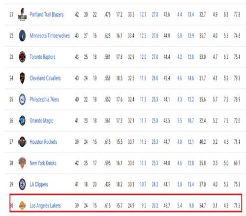湖人本赛季场均抢到41.0个篮板球排名联盟第26位,和球队的防守效率一样,也是联盟倒数第五。都说篮板球是生命线,都说防守赢得总冠军,偏偏湖人在这两个环节都是全联盟倒数的级别,谈何冲击总冠军?