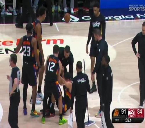 本场比赛,太阳队除了输球之外还两度遭遇球员伤情。在后,德文-布克在第三节最后时刻也遭遇伤情:他在太阳队最后一攻时注意力完全放在了后场推进的队友身上,结果却没看到身前的老鹰球员,右脚踩到了对方的脚造成90度崴脚。倒地后的布克表情非常痛苦,最终他在队友和工作人员的帮助下起身并回到了更衣室,最终他也提前退场。
